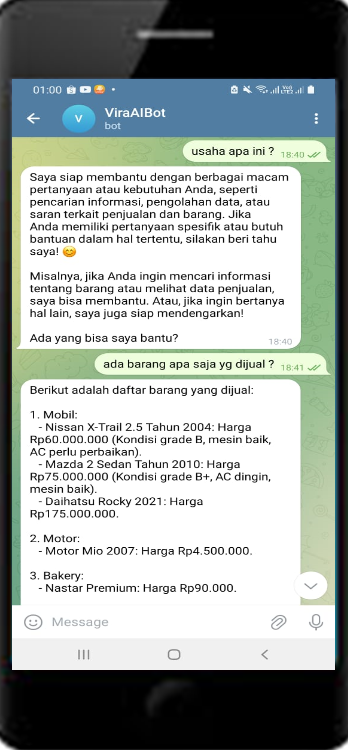 AI Sales Agent yang ditugaskan untuk membantu menjawab semua pertanyaan terkait produk tertentu. Dengan AI Sales Agent ini semua pertanyaan pelanggan dijamin tidak ada yang terlewatkan dan penjualan akan lebih meningkat lagi. AI ini dilakukan melalui aplikasi Chat "Telegram"
