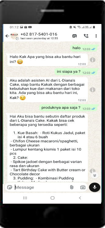 AI Sales Agent yang ditugaskan untuk membantu menjawab semua pertanyaan terkait produk tertentu. Dengan AI Sales Agent ini semua pertanyaan pelanggan dijamin tidak ada yang terlewatkan dan penjualan akan lebih meningkat lagi. AI ini dilakukan melalui aplikasi Chat "Whatsapp"